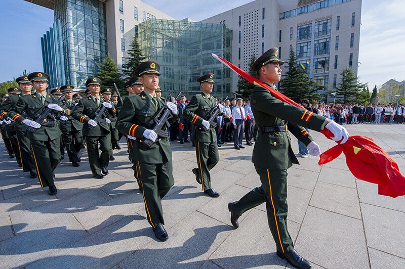 上午9时,铿锵有力的脚步声在广场上响起,在场师生屏气凝神把目光投向国旗护卫队走来的方向。由30名在校生组成的国旗护卫队挺拔威武,迈着整齐的步伐,护卫国旗走向升旗台。伴随着威武雄壮的《义勇军进行曲》,鲜红的五星红旗冉冉升起,在场师生齐唱国歌,肃立行注目礼,共同感受这一庄重而自豪的时刻。