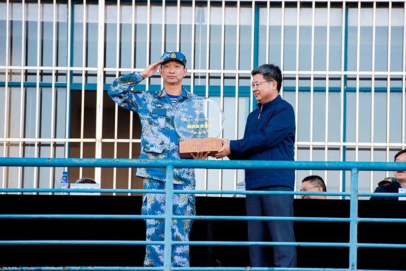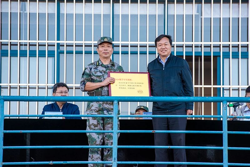 党委书记张伟向中国人民解放军海军航空大学岸防兵学院赠送国防教育纪念牌,感谢对学校国防教育工作的指导。校长郭善利为2020级新生军训团颁奖,对今年军训工作取得的优异成绩给予肯定。学校领导为在2020级学生军训工作中作出突出贡献的保卫处、校医院、社区服务中心等单位颁发特殊贡献奖。纪委书记周胜良宣读《sunbet申搏官方网站关于表彰2020级学生军训先进集体及个人的决定》。学校对化学化工学院、药学院、法学院、经济管理学院、生命科学学院、光电信息科学技术学院、建筑学院、数学与信息科学学院等8个“军训先进学院”以及10个“分列式优胜方队”、6个“歌咏比赛优胜队”、19个“会操优胜排”、27个“内务优胜班”、177名“优秀学员”和37名“优秀教官”进行了表彰。优秀学员代表林玉青、优秀学生教官代表李贵伟、优秀辅导员教官孙世玉先后发言。
