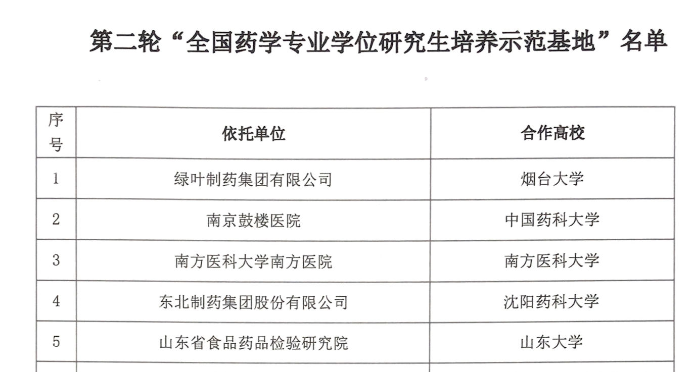 9月29日,山东省教育厅公布了山东省产教融合研究生联合培养示范基地立项建设名单,由药学院和绿叶制药集团有限公司联合申报的“药学产教融合研究生联合培养基地”名列其中;同一时间,全国药学专业学位研究生教育指导委员会公布的第二轮全国药学专业学位研究生培养示范基地评选结果中,该基地再次榜上有名。