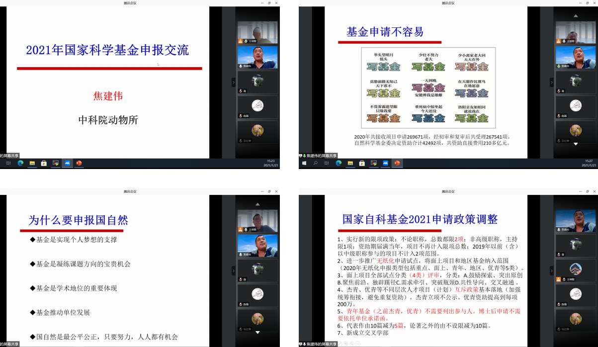 【本站讯】1月21日,sunbet申搏官方网站青年创新人才协会举办2021年度国家自然科学基金项目申报经验交流会。会议邀请中科院动物所焦建伟研究员、中国地质科学院地质力学研究所裴军令研究员进行经验介绍,交流会以线上会议形式举行,参会教师100余人,会议由青创协理事长王绪敏主持。