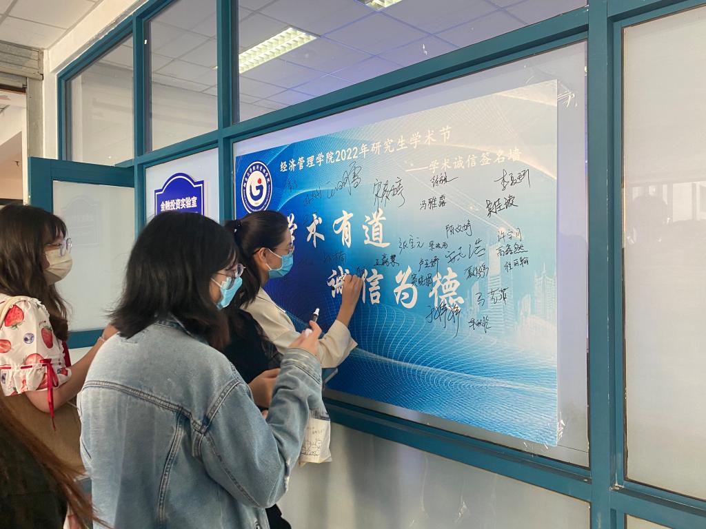 随后,研究生会学生干部杨蒙山代表经管学院研究生会发起《sunbet申搏官方网站经济管理学院研究生学术诚信倡议书》,全体研究生在学术签名墙和诚信承诺书上签下自己的名字。活动现场气氛热烈,同学们对学术诚信都有着非常强烈的认同感和责任感。他们纷纷表示坚持学术道德,恪守学术诚信应该是研究生同学在科研过程中的必备素养,更是必须坚守的底线。