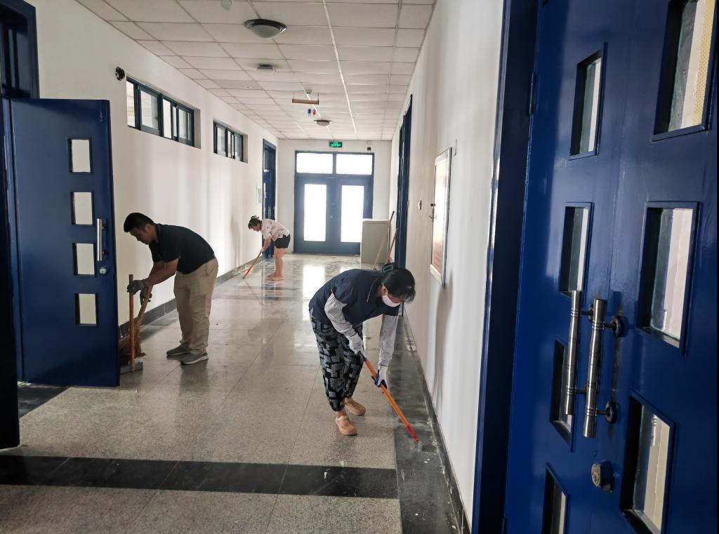 不畏酷暑,推进教学楼公共区域改造。今年暑期持续高温,校园物业服务中心坚持推进八栋教学楼公共区域改造项目。一线职工头顶烈日,加班加点完成了墙皮铲除、油漆补刷、照明设施修缮等一系列工作,确保教学区域以全新的面貌迎接师生返校。