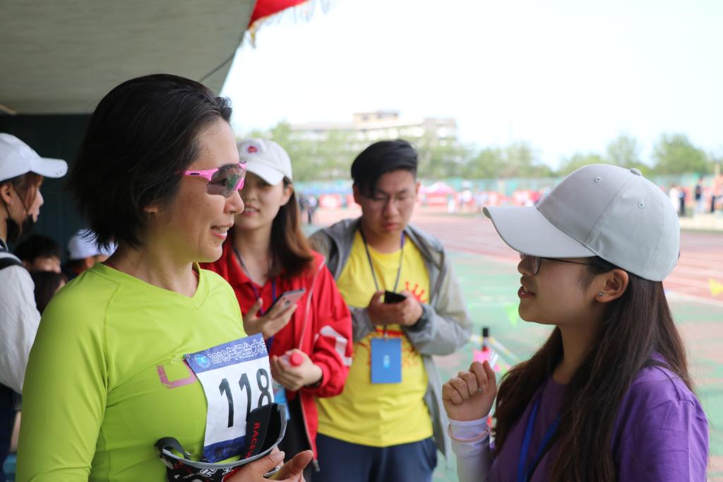 一声枪响,只见老师们奋力冲出。四百米本就是一个极具挑战的项目,需要极大的耐心和毅力。只见一位身穿绿色衣服,戴着护目镜的老师遥遥领先,冲过终点,赢得小组第一。这位老师便是数学信息科学学院的滕雪玉老师,滕雪玉老师从小热爱运动,自己经常坚持锻炼,曾经参加过铁人三项、马拉松等比赛。她向记者说道:“我觉得运动会是一个展示集体风貌的好机会,大家一定要参加。同时,在比赛前我会调整好自己的食谱,让自己处于一个比较健康的状态。这次比赛我对自己的表现是比较满意的。”