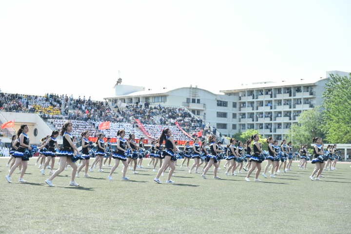 5月16日8时30分,运动会开幕式上,来自外国语学院的啦啦操队身着蓝白相间的统一服装,像一群蓝精灵一样向操场中央奔来。