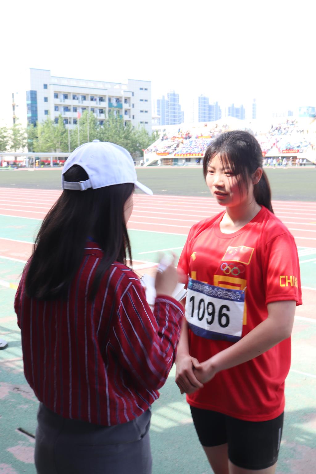 在比赛中,1096号选手刘陵慧的表现可圈可点,在第一轮的第一跳中就取得了11.59米的好成绩,直逼校运动会往届三级跳记录11.70米。第一跳的好成绩无疑鼓舞了参赛选手,在接下来的几跳中,1096号选手刘陵慧也是接连跳出了11.48、11.43米的好成绩,赢得了在场观众的一片欢呼声。