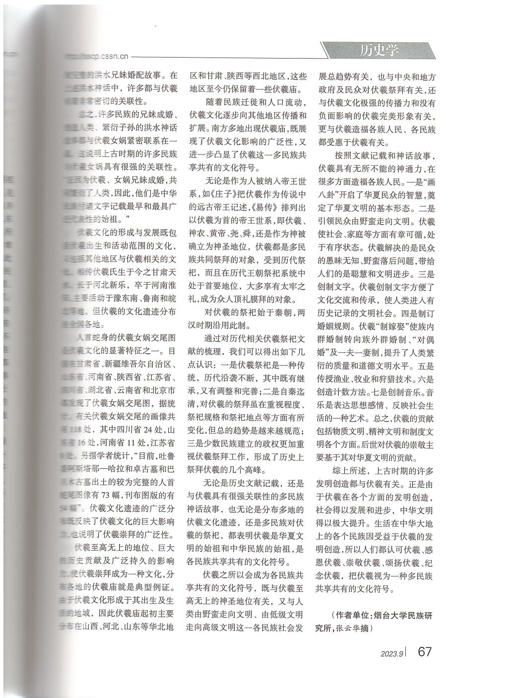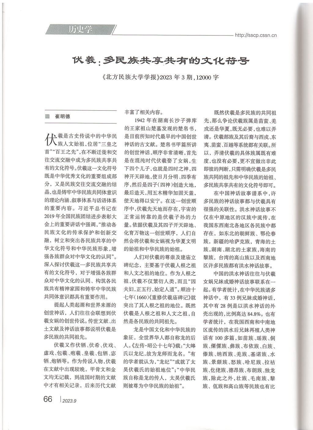 近日,《中国社会科学文摘》2023年第9期主体转载了sunbet申搏官方网站崔明德教授发表于《北方民族大学学报》2023年第3期的理论文章《伏羲:多民族共享共有的文化符号》。