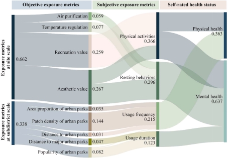 该研究面向城市化发展带来的人口增长和土地利用变化及公共卫生压力等环境问题,旨在通过探究多尺度视角下城市绿地暴露对居民健康福祉的影响机理,为通过城市绿地规划管理实践建设健康人居环境提供科学依据。该研究构建了联系不同空间尺度下客观与主观绿地暴露及居民自评健康状况的概念模型,并以公园绿地这一关键城市绿地类型为例,通过横断面研究验证模型假设和构建量化路径。研究结果表明,场地和社区尺度下绿地暴露特征均对居民自评健康状况有显著的积极影响,但绿地暴露对健康福祉的贡献因空间尺度而异,其中场地尺度绿地暴露对健康福祉影响的总体重要性更高;在不同空间尺度下的绿地暴露特征中,场地尺度下绿地美学价值通过促进居民静态行为对心理健康的贡献最大,社区尺度下绿地可获得性通过提高居民的绿地使用频率对身体健康的贡献最大(图1)。